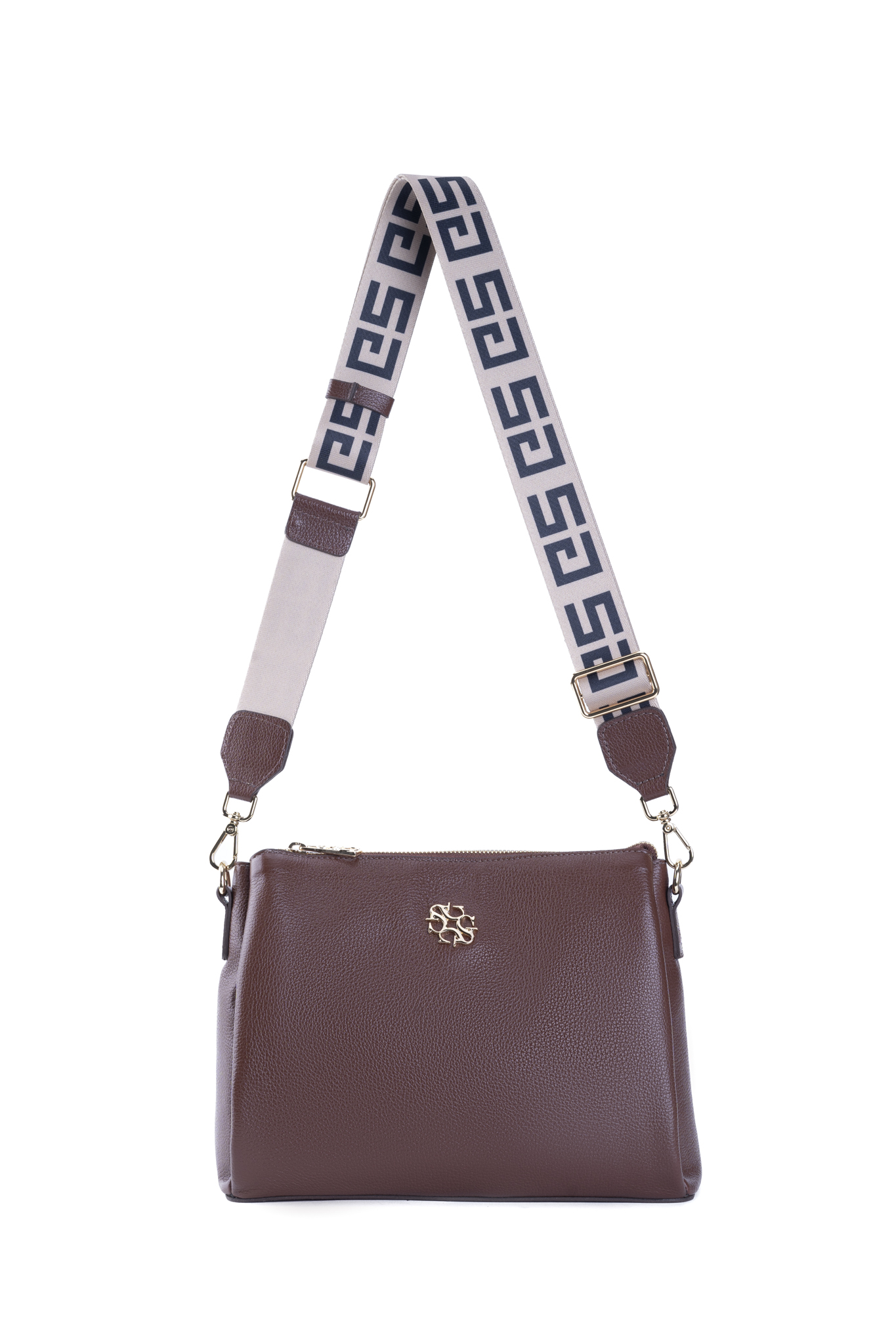 Bolsa com três divisórias interna com fechamento em zíper na boca. Alça transversal em poliéster com regulador. Bolso traseiro com zíper. Bolso interno com zíper e porta celular em tecido, forro de gorgurão bege e metais de qualidade.