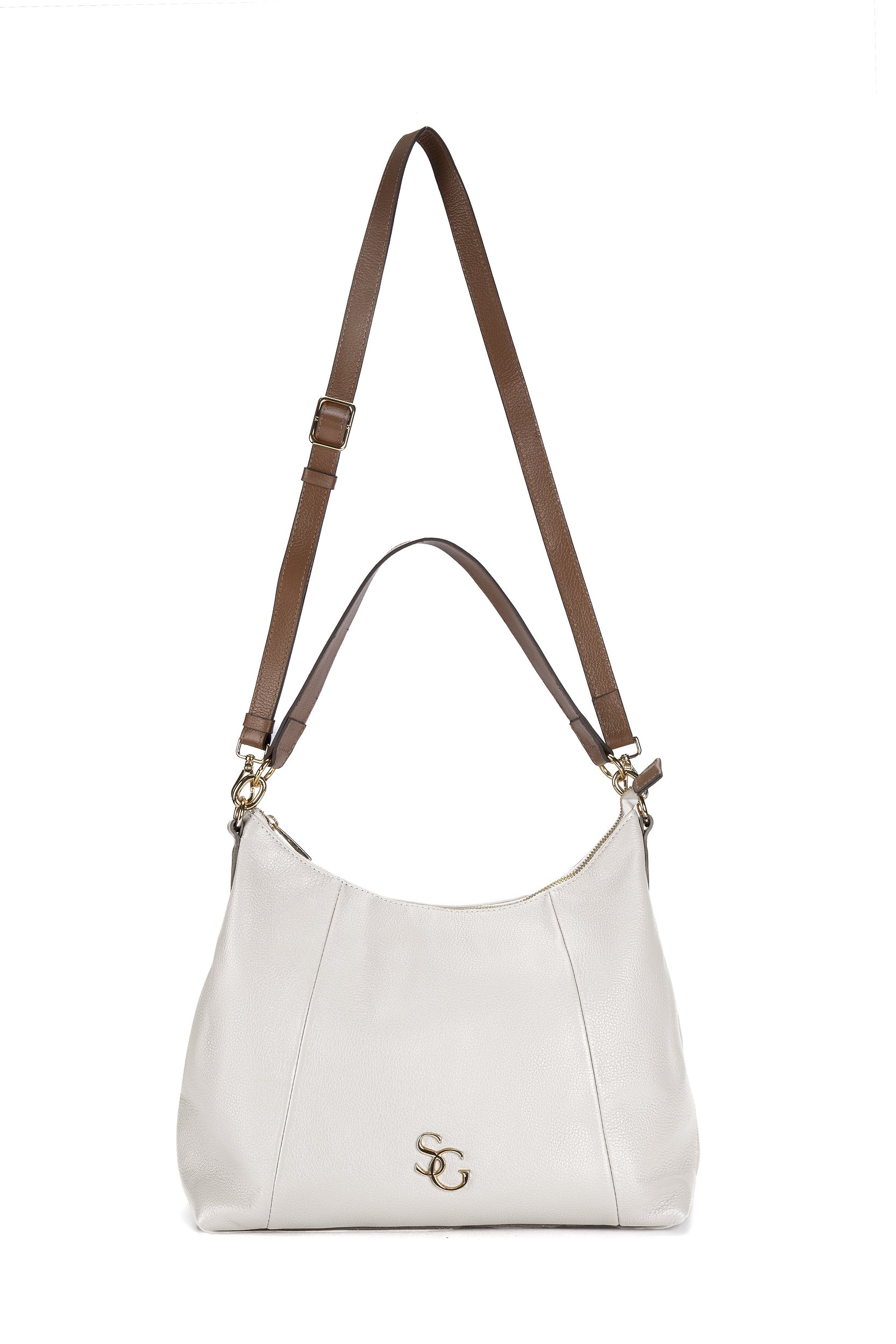 Bolsa em couro soft. Bolso traseiro com zíper. Bolso interno com zíper e porta celular em tecido, forro de gorgurão bege e metais de qualidade.