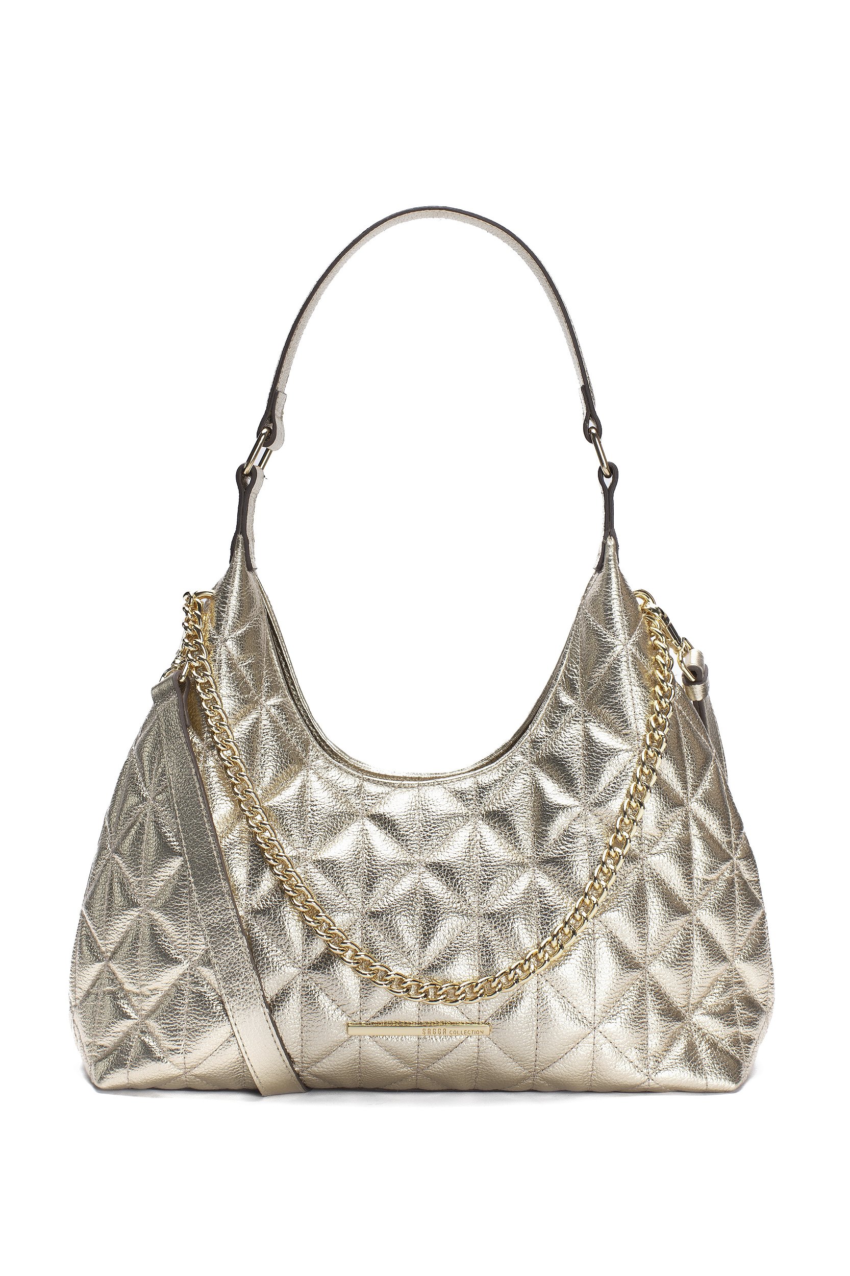 Bolsa criada e produzida no Brasil em couro legítimo. O modelo possui alça de corrente, alça longa e alça de couro para ombro. A presença da corrente metalica dourada mantém o glamour, reforçando a estética do minimalismo refinado, tendência que une funcionalidade e elegância com maestria que só a Sagga tem.