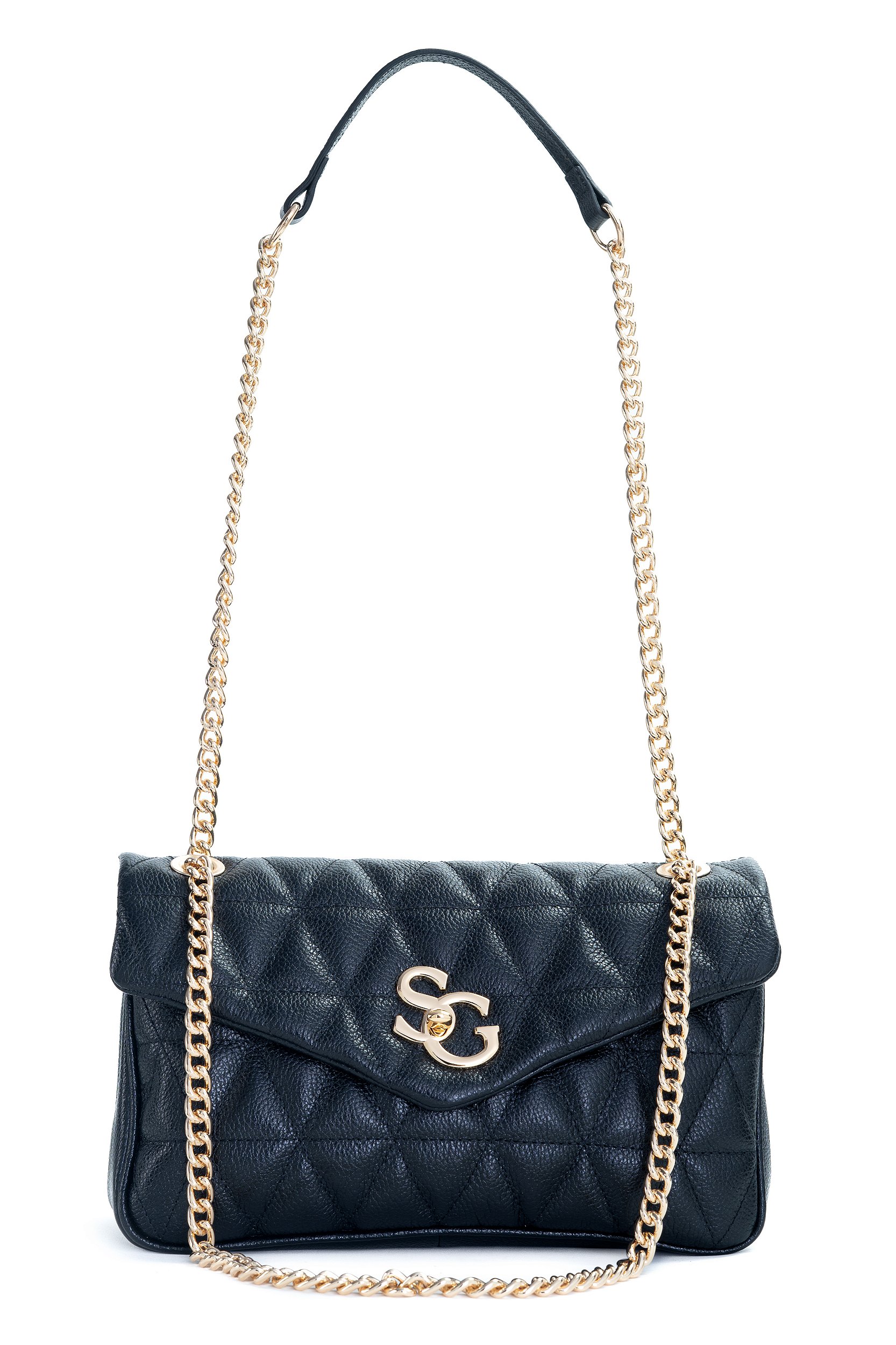 Abertura com fechadura personalizada SAGGA. Duas divisórias com zíper no centro. Bordado matelassê no couro. Bolso interno com zíper. Porta celular em tecido, forro de gorgurão bege personalizado e metais de qualidade. Alça de corrente regulável com opcional de ombro e ombreira de couro ou alça longa transversal.